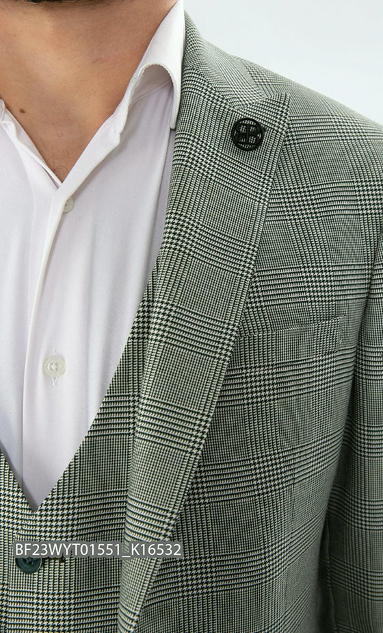 Ткань светло-зеленого цвета со стильной шотландской клеткой в тон, на пересечениях образующей орнамент «pied-de-poule», гарантирует максимально стильный и респектабельный внешний вид.