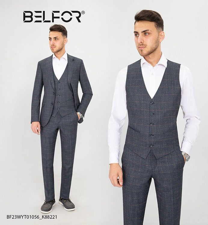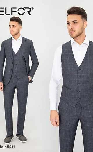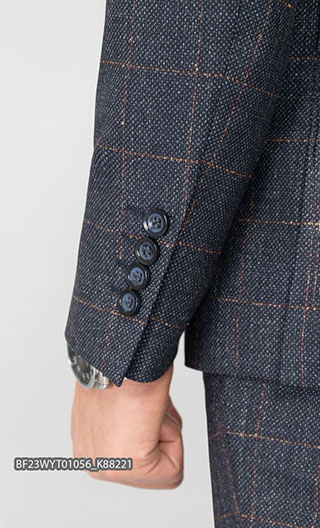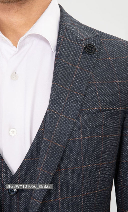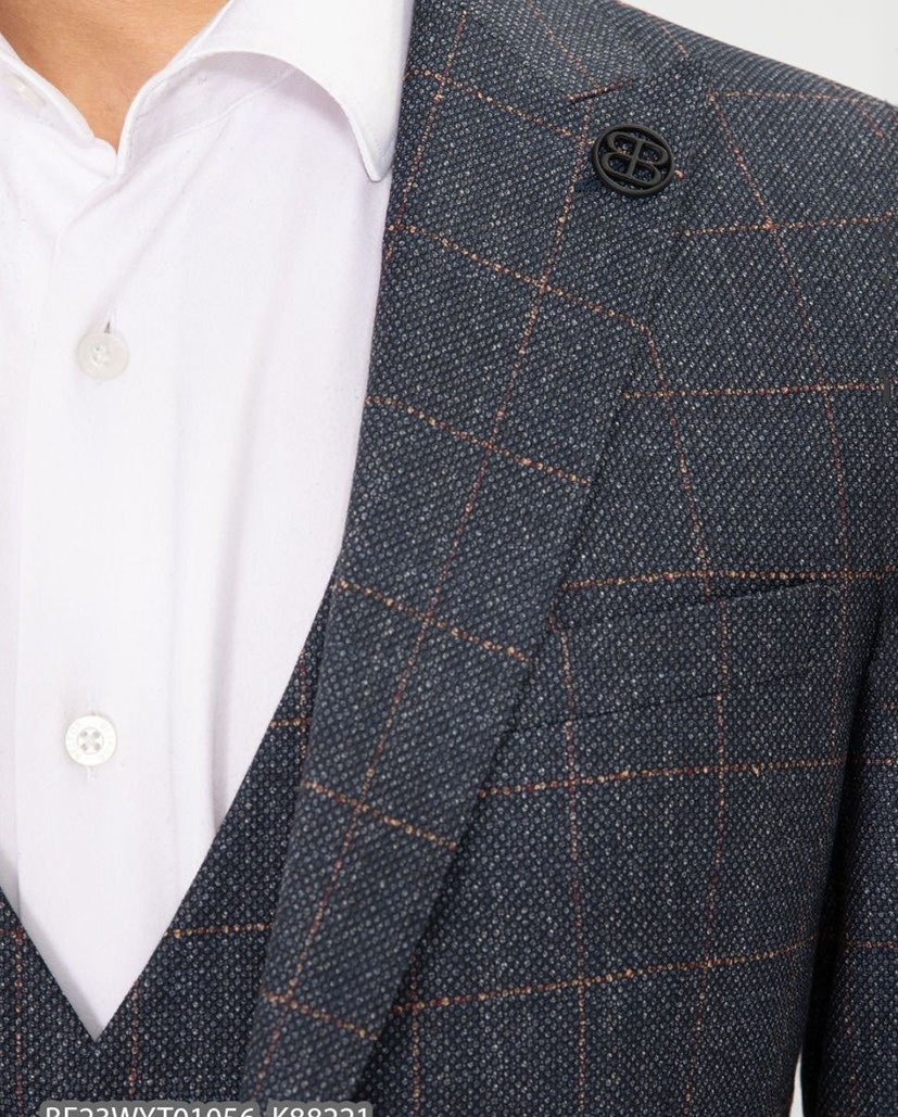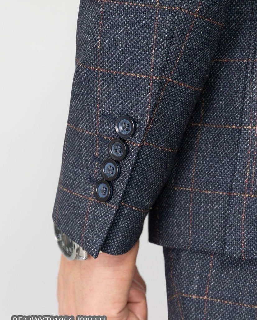 Ткань красивого серо-синего цвета с красивой твидовой текстурой, дополненная коричнево-бордовой клеткой, гарантирует стильный и респектабельный внешний вид.