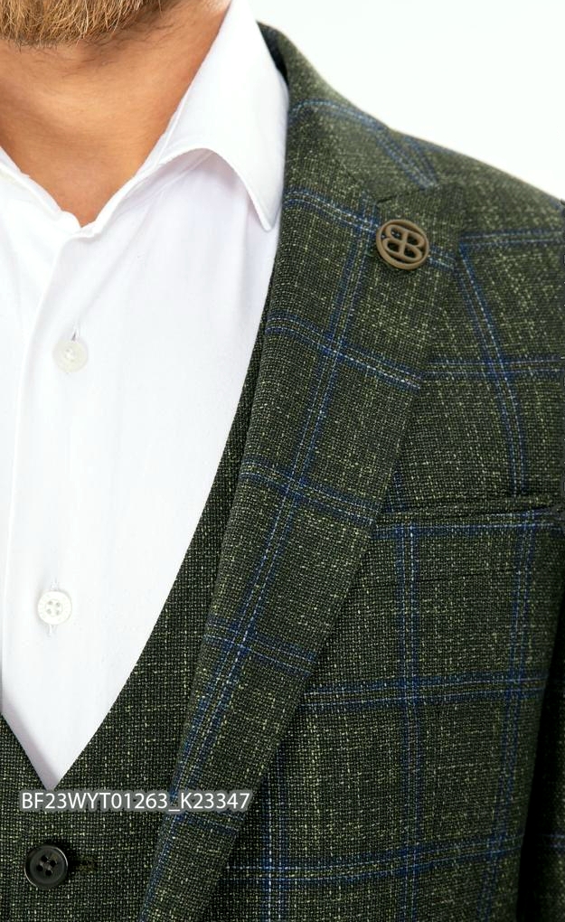 Ткань модного зеленого цвета с красивой текстурой, дополненная синей клеткой (только для пиджака, брюки и жилет без клетки), гарантирует стильный и респектабельный внешний вид.