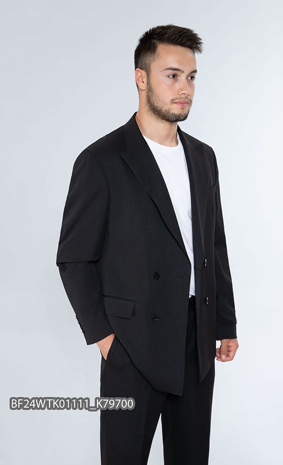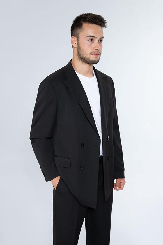 Как ни крути, а черный цвет самый популярный и востребованный у покупателей. Неувядающая классика. А в оверсайзном двубортном исполнении черный костюм выглядит строго и одновременно модно.