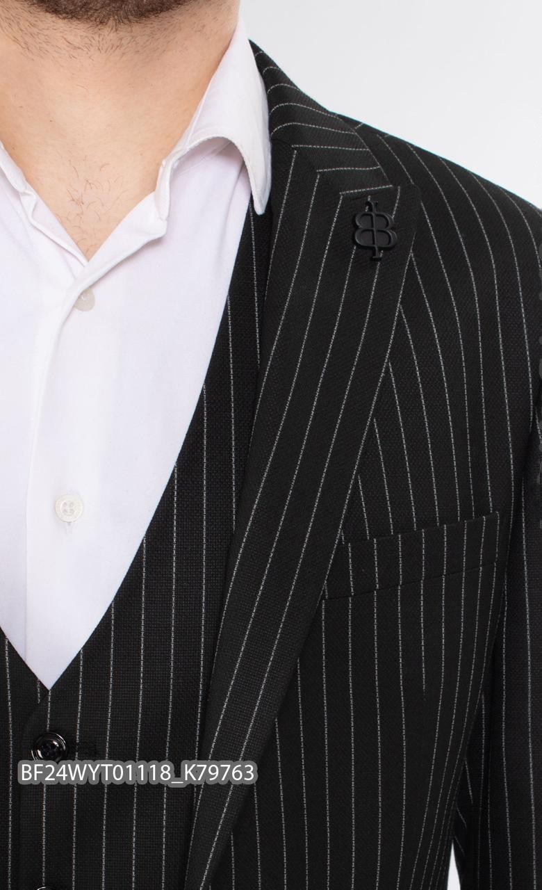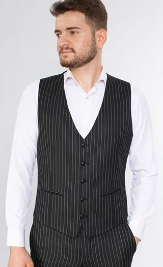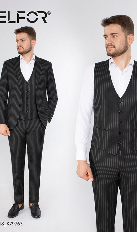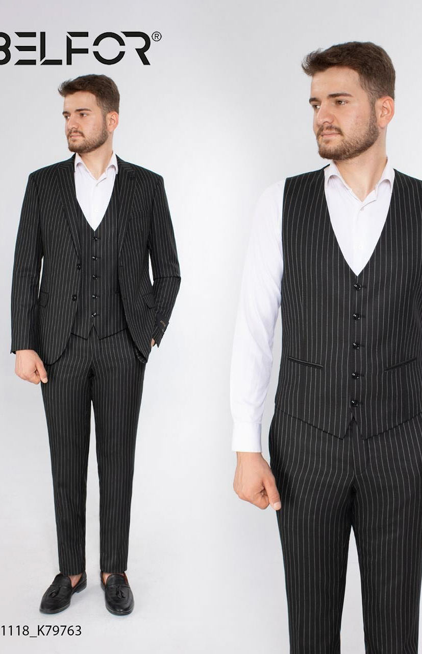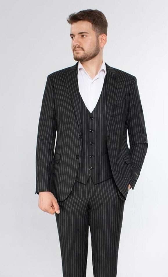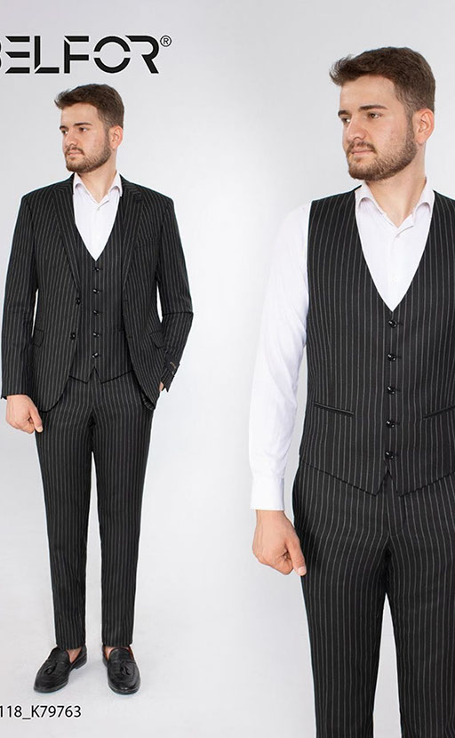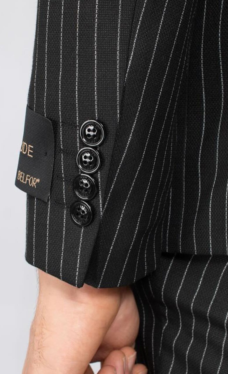 Ткань черного цвета с выраженной элегантной полоской гарантирует супер-стильный внешний вид. Костюм имеет крой slim fit, но благодаря эластану в составе материала даёт владельцу свободу движений и повышенный комфорт.