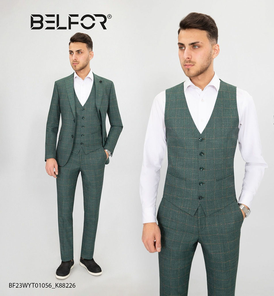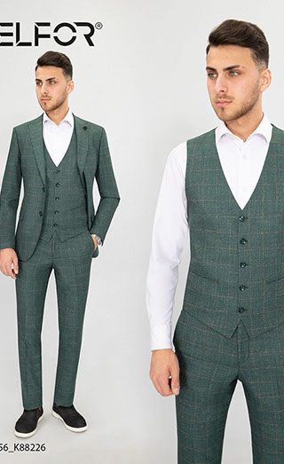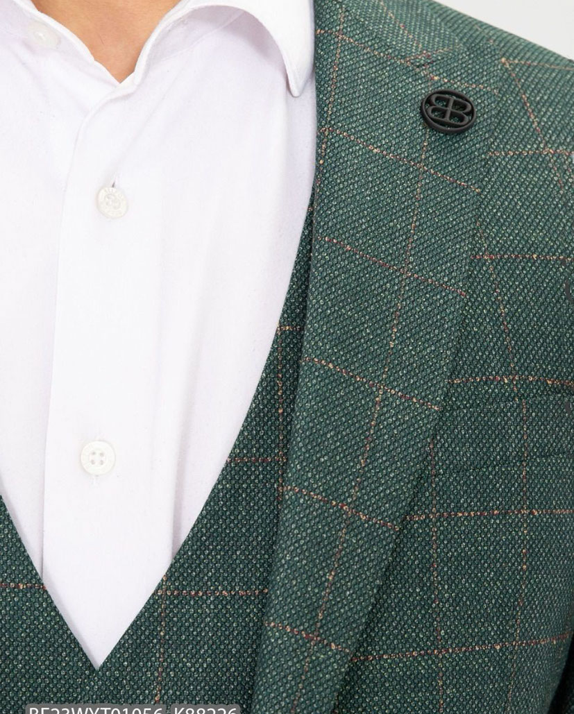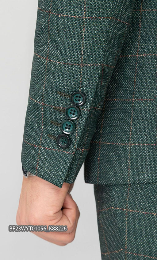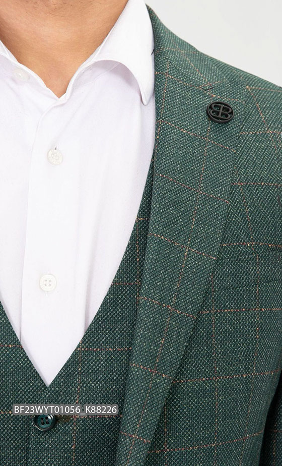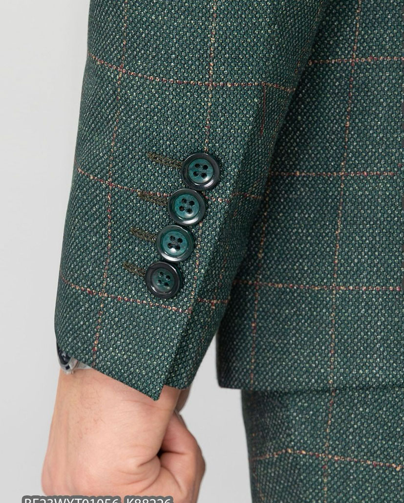Ткань модного зеленого цвета с красивой твидовой текстурой, дополненная коричнево-бордовой клеткой, гарантирует стильный и респектабельный внешний вид.