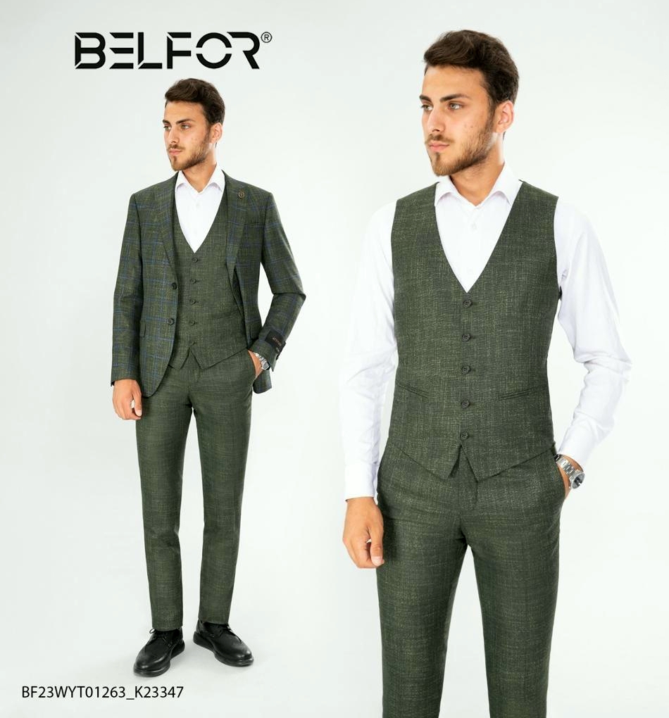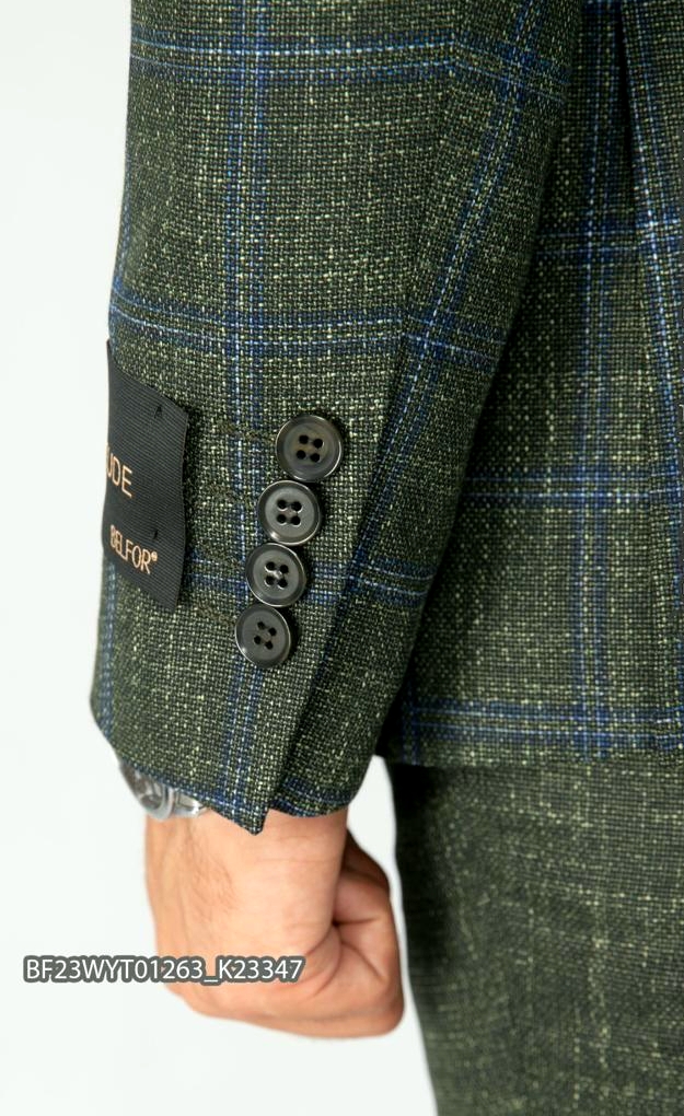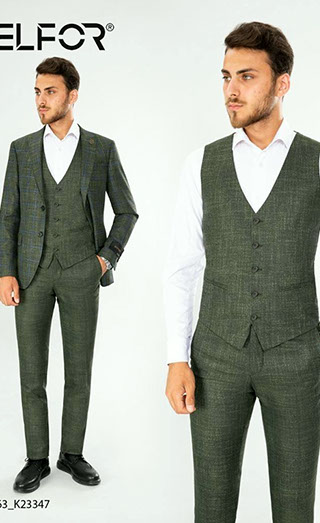 Ткань модного зеленого цвета с красивой текстурой, дополненная синей клеткой (только для пиджака, брюки и жилет без клетки), гарантирует стильный и респектабельный внешний вид.